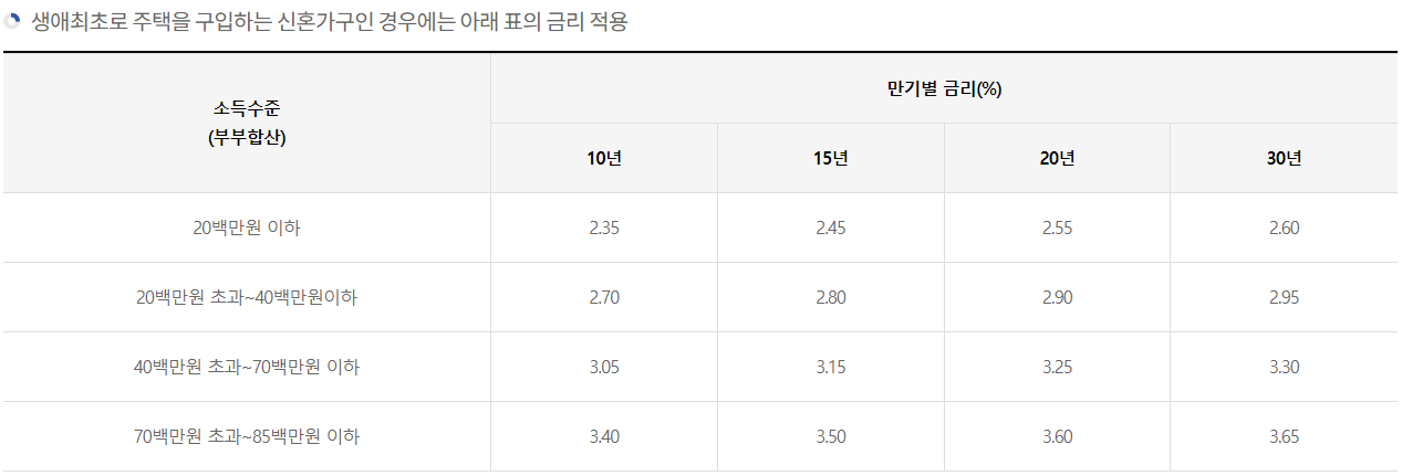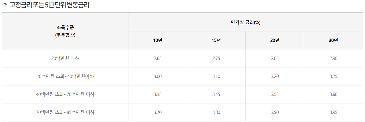 주담대 금리는 소득 수준에 따라 달라집니다. 한국주택금융공사의 내집마련디딤돌대출을 예로 들어볼까요?